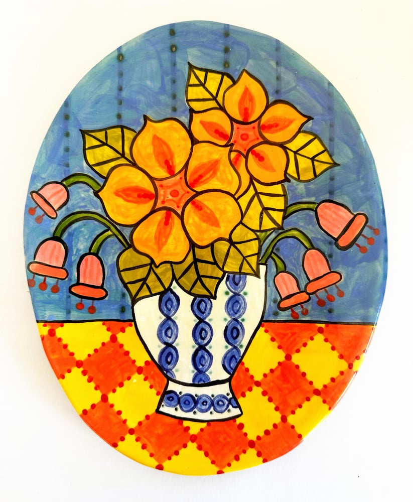 I make each platter out of white earthenware clay. Each platter is inspired by the antique pottery I collect and flowers I grow in my garden here in western Massachusetts each summer. I use underglazes for the color. Each color must be applied 3 times in order to obtain the saturated shades I love. Each piece is fired twice in a ceramic kiln and finished with a shiny glaze.