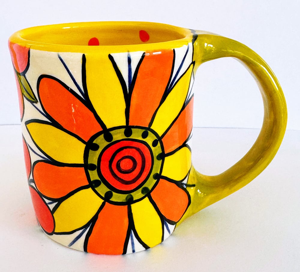 This mug is thrown by me of earthenware clay on my potter's wheel in my studio in western Massachusetts. The handle is pulled and added once the mug is partly dry. Once dry, the food safe lead free colors are applied with a brush and then the thin black detail lines are painted on with a fine brush. I also add some sgraffito to add texture and white highlights.