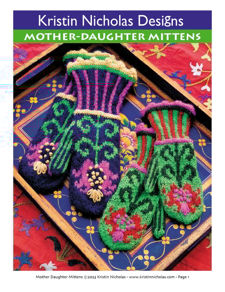 These folkloric mittens feature a shaped four color cuff with bobble trim. The main section of the mittens is worked in Fair Isle knitting in a motif inspired by embroidered textiles from Uzbekistan. (Note the antique suzani background which I picked up at a flea market several years ago.) The mittens are embellished with French knots and lazy daisy embroidery.